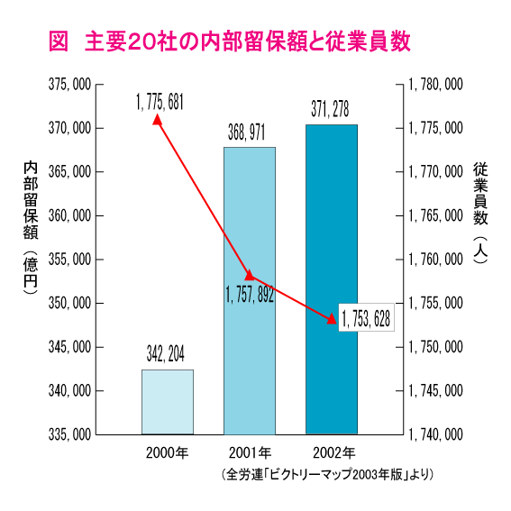 名目賃金は4年連続でダウンし、雇用は「失業地獄」にあり、企業倒産は戦後2番目の高水準です。一方で、財界・大企業は、不況下でも大儲けを続けています。日立、トヨタ、NTTなど主要企業20社の連結決算だけを見ても、この一年間に5000人近い人減らし「合理化」、中小・下請けいじめを強行して、内部留保は2307億円も増加。内部留保の合計は37兆1278億円にもなっています。まさに利潤の集中、大企業の「リストラ太り」が強まっています。