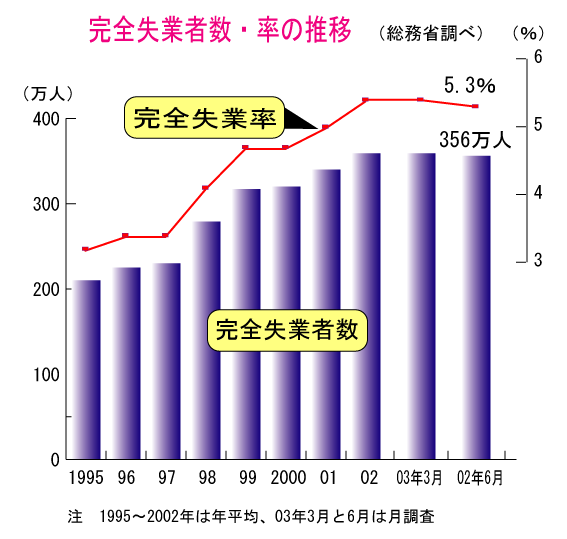 方針案では、国公労働者のくらしや労働にかかわって、(1)アメリカの「一国・覇権主義」が世界と日本の平和をゆるがしていること、(2)小泉「構造改革」の強行が、雇用・くらし・いのち・平和の危機の元凶であること、(3)大企業の横暴が労働者のくらしと地域社会を直撃していること、(4)公務の公共性破壊攻撃がいっそう激しくなっていること、(5)悪政や道理のない「改革」への国民の反撃がおき始めていること、の5点を特徴的な情勢と捉えています。(失業者数などは図1参照)