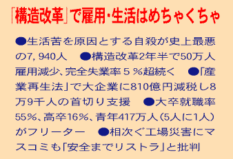 「構造改革」によるこの2年半で、雇用破壊をはじめ、働くものの権利が一層ふみにじられました。今度の総選挙では、イメージにまどわされず、自分たちの暮らしをよくしてくれる候補者を見極めて投票することが大切です。“政治”というと「自分には関係ない」とか「誰がやっても政治は同じ」とか、あきらめがちですが、“あきらめは悪政の手助け”になりますから、棄権などせず、主権者=国民として政治を私たちの手にとりもどしましょう。