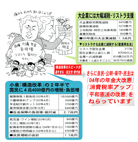 下の表にあるように、小泉構造改革の2年半で、医療・社会保障は連続改悪され、来年には「史上最悪の年金大改悪」「消費税の大増税」へのレールがしかれようとしています。