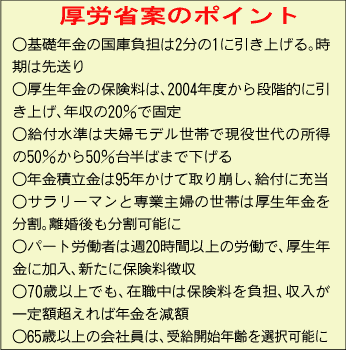 厚生労働省は11月17日に、2004年「年金改革」に関する同省案を発表しました。これをもとに、政府・与党は年内に政府案を確定して、来年の通常国会に関連法案を提出する方針です