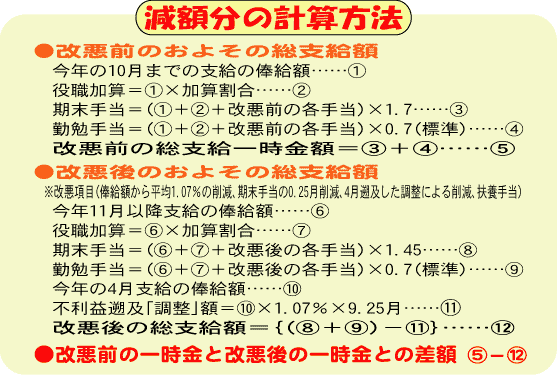 今年の冬の一時金は、マイナス給与法による月数と支給額の引き下げ、不利益遡及により総支給額が減額され、さらに総報酬制による共済掛金の徴収により、大幅な手取りの減収となります。