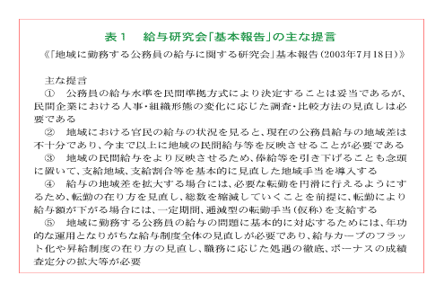 人事院は03勧告時の「報告」において、「地域に勤務する公務員の給与に関する研究会」報告もふまえた俸給表構造(給与制度)の全面的な「見直し」を宣言し、現行の給与制度では中央・地方の格差反映が不十分としました。