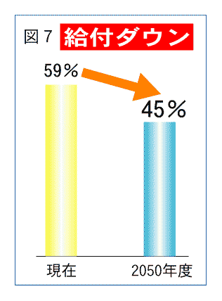 厚生年金の保険料は、今後20年間に現行13・58%(労使折半)を1・5倍の20%まで引き上げようとしています。しかも、毎年0・354%ずつ自動的に引き上げ、20%になってやっと固定し、不足すれば給付カットをするというものです(図6=「保険料固定方式」と言っています)。