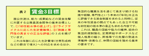 こうした改革構想に対しては、改めて「賃金3目標」(表2)を対置する必要があります。これは、初任給周辺の低賃金の是正など現行の年功賃金の弱点は克服しながらも、ライフステージに応じた住居費、教育費などの生計増や、職員の育成段階に応じた職務内容の高度化を適切に反映できる賃金を要求するものです。それはまた、能力主義で査定(評価)や管理が強められる息ぐるしい職場を否定し、協力・共同と励まし合いを大切にする職場の確立をめざします。