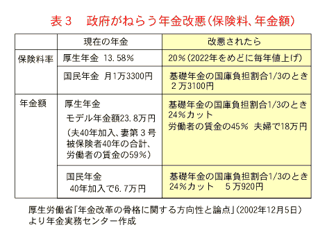 年金額については、引き上げた保険料や率で「固定」された範囲で年金給付を自動的に抑制する「マクロ経済スライド」という新制度を導入することをねらっています。現在、厚生年金のモデル年金(標準的な年金)は現役男子労働者の平均賃金の59・4%の額とされていますが、基礎年金の国庫負担割合2分の1の場合は52%となりダウン率は12%、3分の1のままの場合は、45%とダウン率は24%にもなります(図7、表3)。さらにこの方式は、将来の年金の大幅引き下げのみならず、現役年金受給者の年金額をも毎年引き下げることを可能にしようとしています。