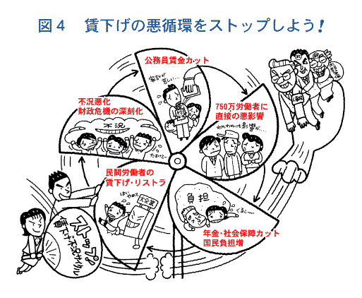 こうした財界の春闘解体攻撃をうち破る春闘の再構築、「賃下げの悪循環」(図4)を止める運動が大切になっています。政府・財界による全面的な国民収奪の攻撃がすべての国民に襲いかかっています。それだけに、労働者のみならず、農民や商工業者をはじめとする国民諸階層とも連帯した「国民総決起春闘」をより豊かに発展させることは、組織された労働者の責任です。