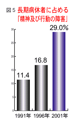 こうした労働の実態が、職員の心身の健康に悪影響を及ぼさないはずはありません。3月に人事院が発表した長期病休者の調査結果によれば、「精神及び行動の障害」が、5年前に比べ増加し、男女とも1位になるなど、顕著な変化を示しています(図5)。どこの職場でも、仕事をする上での、人員、時間など大切な「ゆとり」が失われてきているのではないでしょうか。