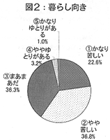 暮らし向きについての問いには図2のとおり、およそ6割が「苦しい」と答えており、昨年と比較すると「まあまあだ」が約5%増え、「苦しい」が5%減っています。