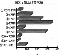 賃上げ要求額の集計結果は図3のとおりで、これまでと同じような結果が出ており、3万円と5万円のところが山になっています。ただ、今回の特徴的なことは、3万円以下の要求額が過半数を超えており、昨今の経済状況の厳しさから、より現実的な選択をしているものと思われます。