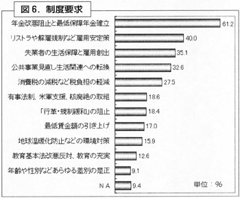 制度要求は図6のとおり。圧倒的に「年金改悪阻止と最低保障年金確立」が多く、国民に負担を押しつける政府の悪政をやめさせるとともに、厚生労働省の職員として、働きがいにも直結する制度要求に集中しました。続いて、「リストラや解雇の規制」「失業者の生活保障と雇用創出」となっており、政府の進める失業・雇用対策の実効性がないことを表しています。